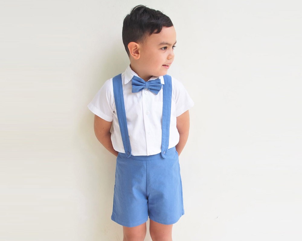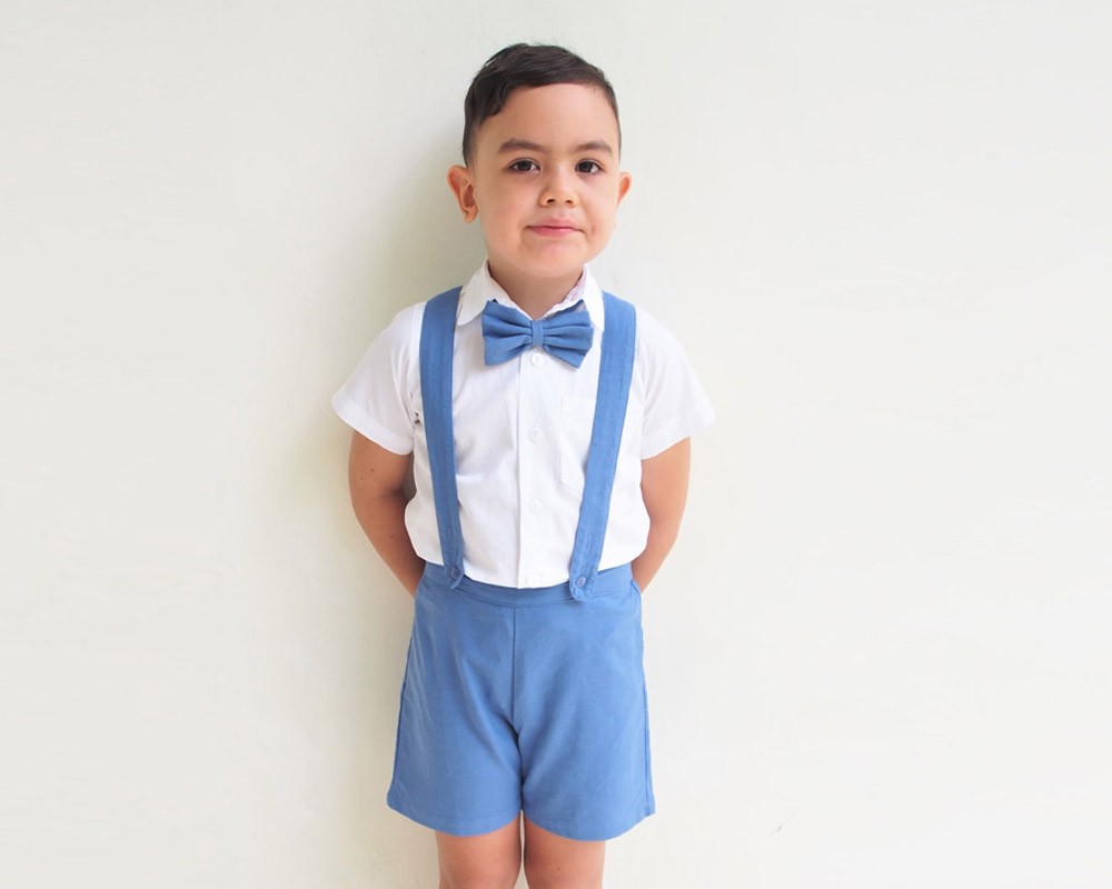 Suspender Shorts have a flat front waistband with elastic back and fully removable suspender straps that attach with buttons in the front and back.