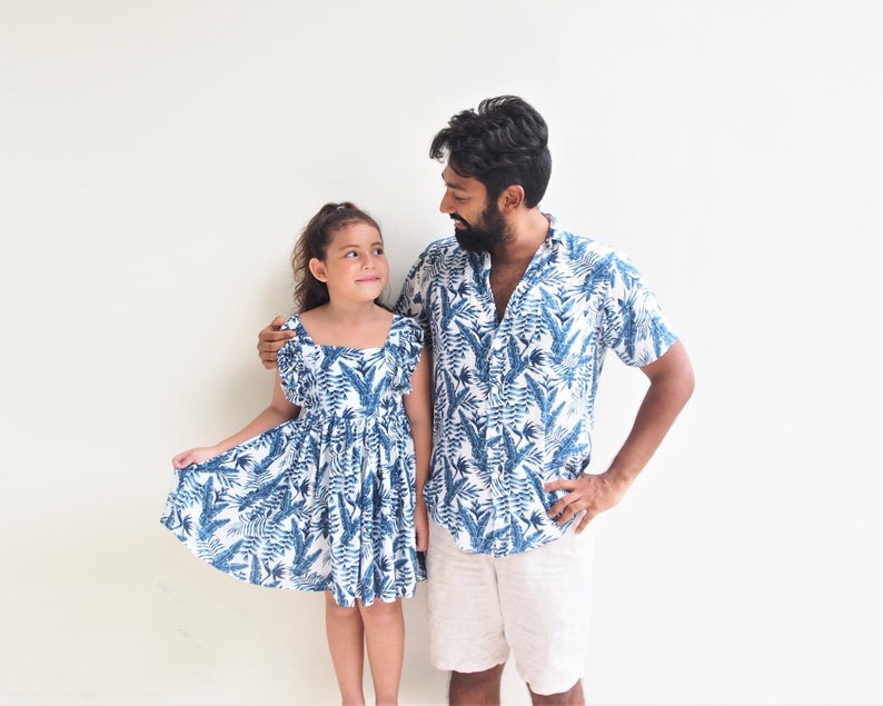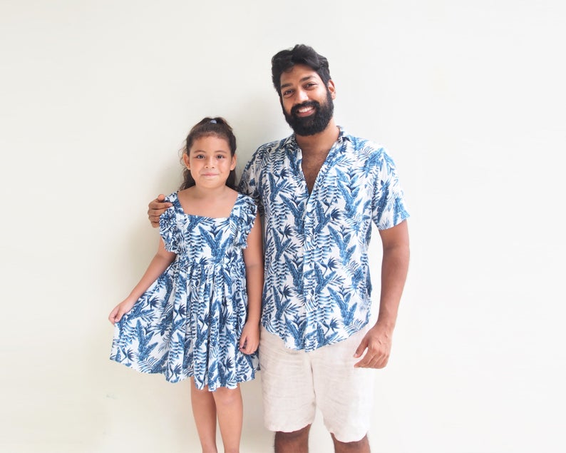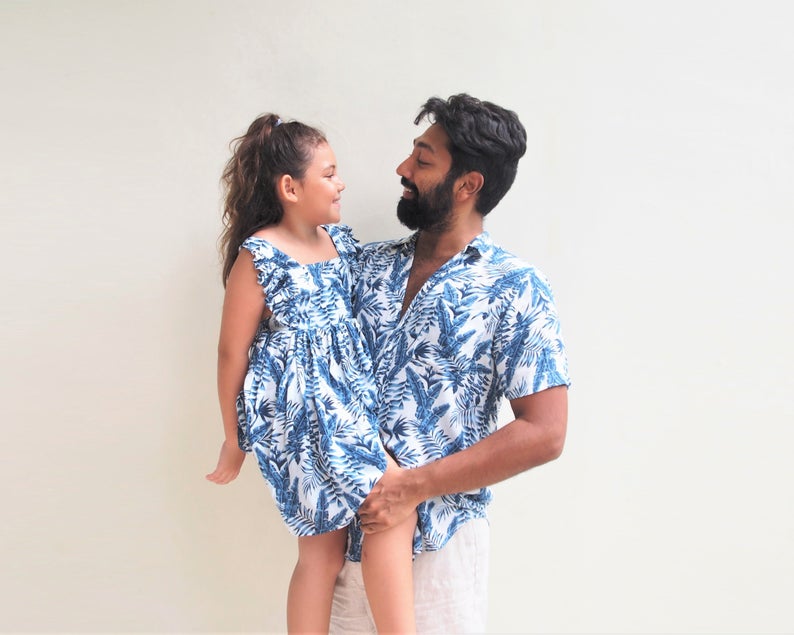 Now Dad can match his little one in this amazing Father and Daughter matching Tropical leaf Button up Shirt and Dress set!